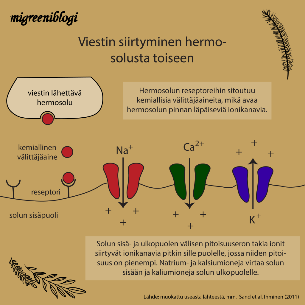 Migreeni on neurologinen sairaus eli se liittyy hermostoon1. Vaikka kohtausten syntymekanismia ei täysin ymmärretä, tiedetään siitä kuitenkin paljon. Aloitankin tällä kirjoituksella pidemmän kirjoitussarjan, joka tähtää kansantajuistamaan migreenin syntymekanismia sekä migreenikoilla tiedettäviä geneettisiä eroja. Yritin aloittaa kirjoittamisen migreenikkojen hypersensitiivistä aivoista ja siitä mitä se tarkoittaa, mutten päässyt kovin pitkälle kaivautumatta ensin siihen, miten hermosolut viestivät keskenään, joten aloitan kirjoitussarjan esittelemällä hermosolujen viestintämekanismia eli hermoimpulssin johtumista. Tämä kirjoitus perustuu pitkälti teokseen Ihminen – Fysiologia ja anatomia2, jota käytetään mm. Helsingin yliopiston Ravitsemusfysiologian kurssin yhtenä kurssikirjana. Kirjoituksen loppuun olen linkannut todella hyvän englanninkielisen videon, jossa hermosolujen viestintä selitetään selkeästi hyvin tehdyn animaation avulla.